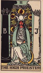 הכוהנת הגדולה יושבת בין שני עמודים – שחור (בּוֹעַז) ולבן (יַכִּין), המייצגים ניגודים כמו אור וחושך. הירח בקדמת רגליה מרמז על מחזוריות ורגש, והקלף שהיא מחזיקה כתוב באותיות עבריות – התורה.